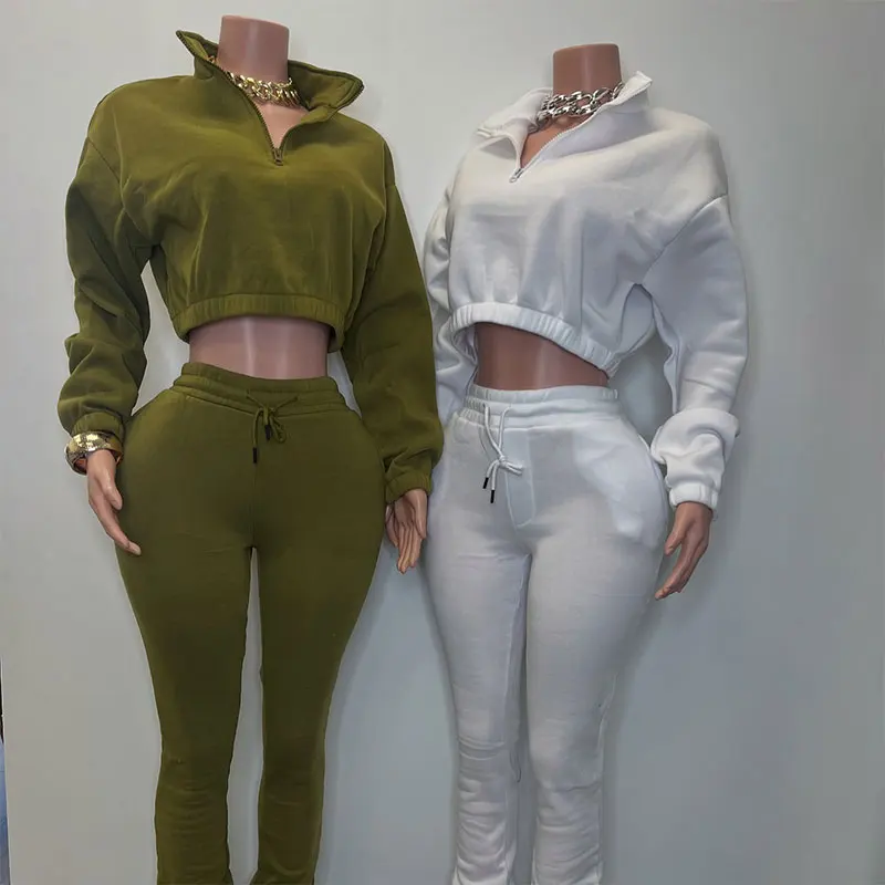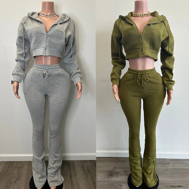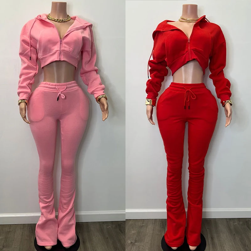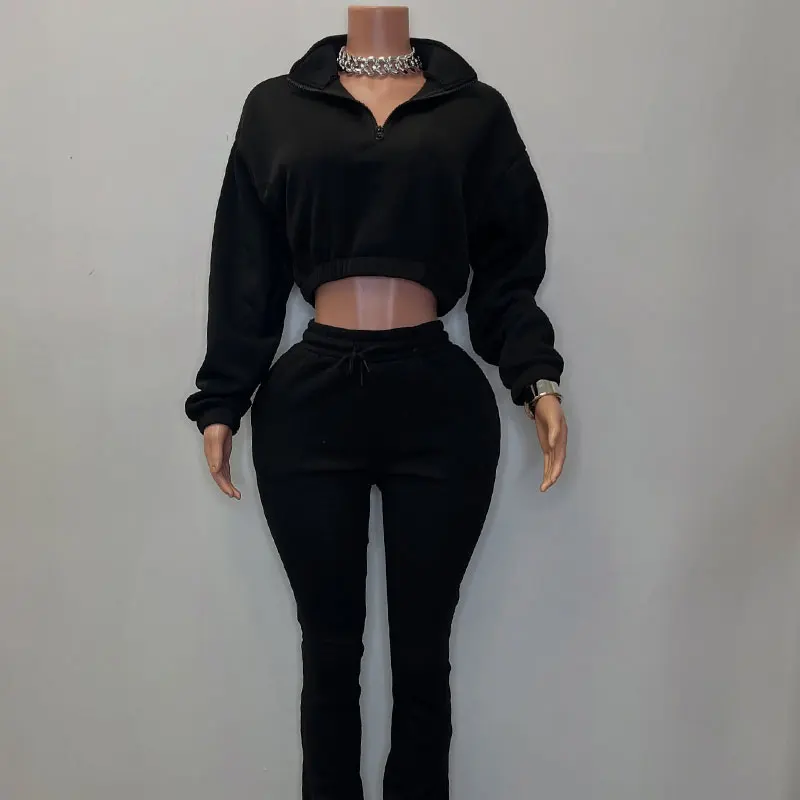 Huili Manufacturer Oem High Quality Cotton French Terry Crop Stand Collar Sweatshirt & Flare Sweatpants 2025 Women Hoodie Set
